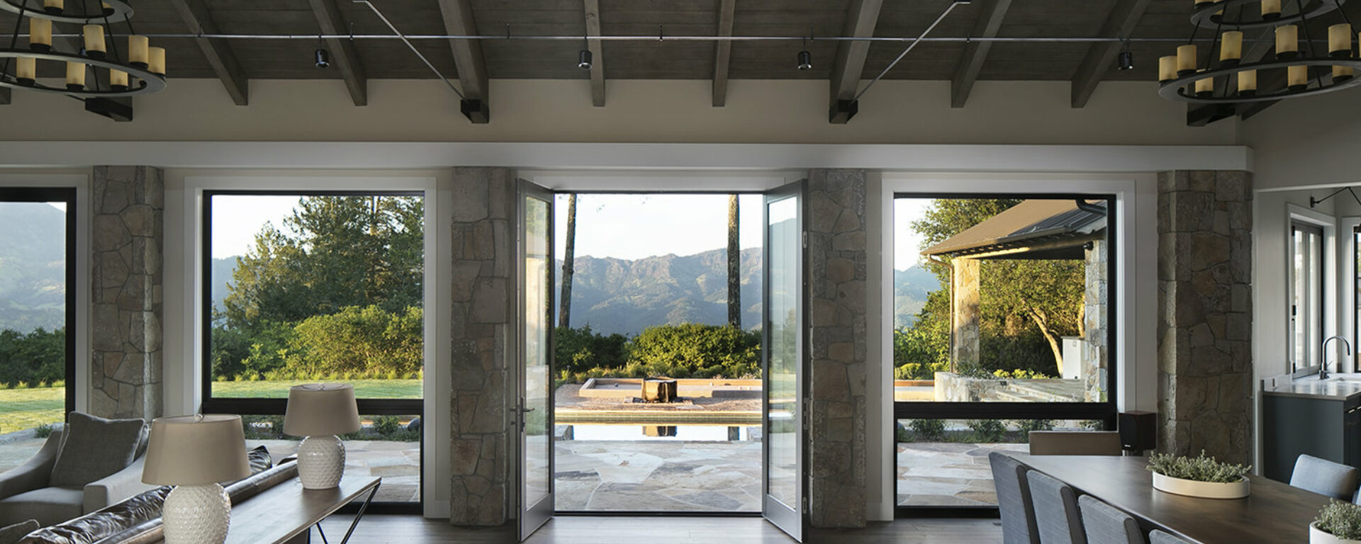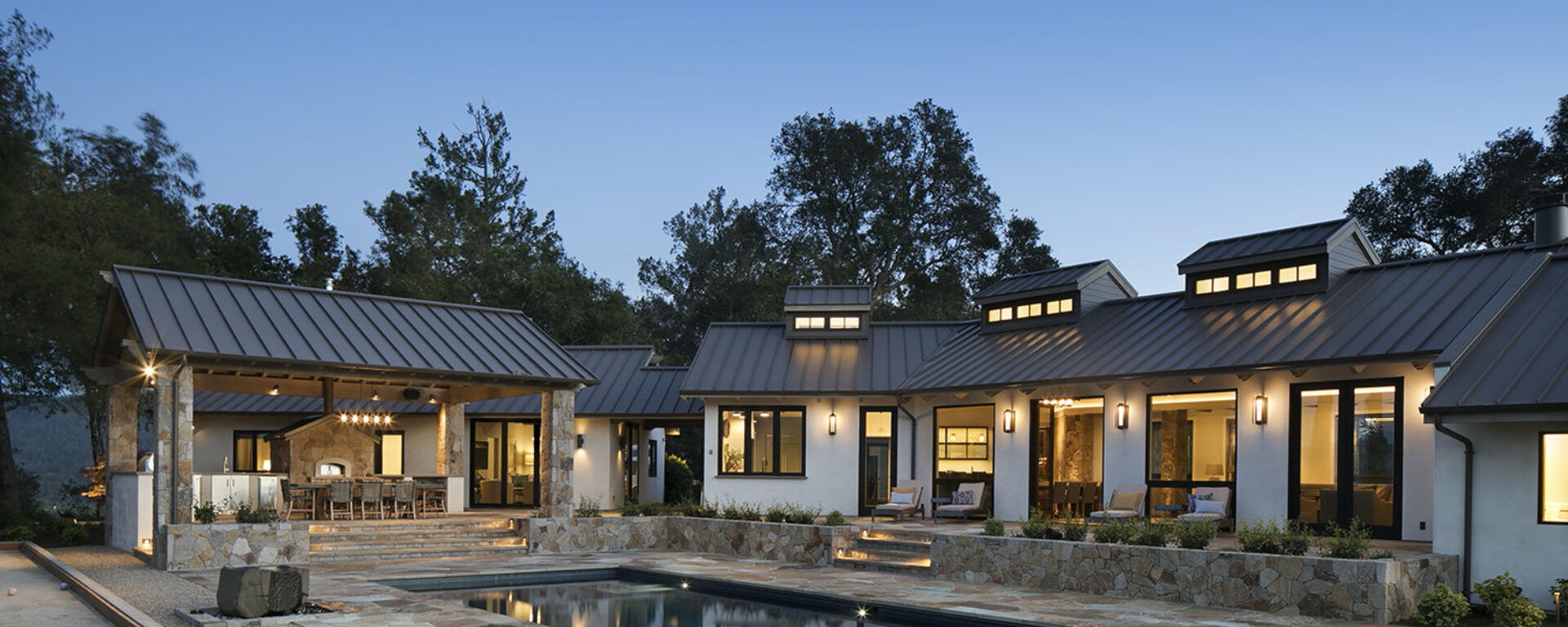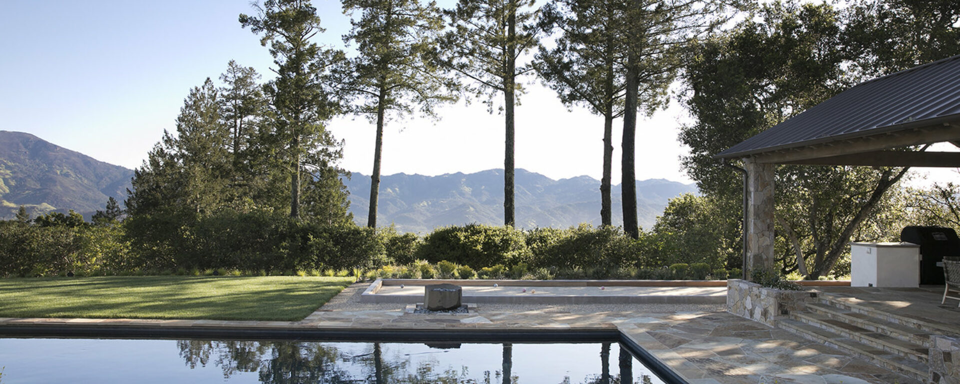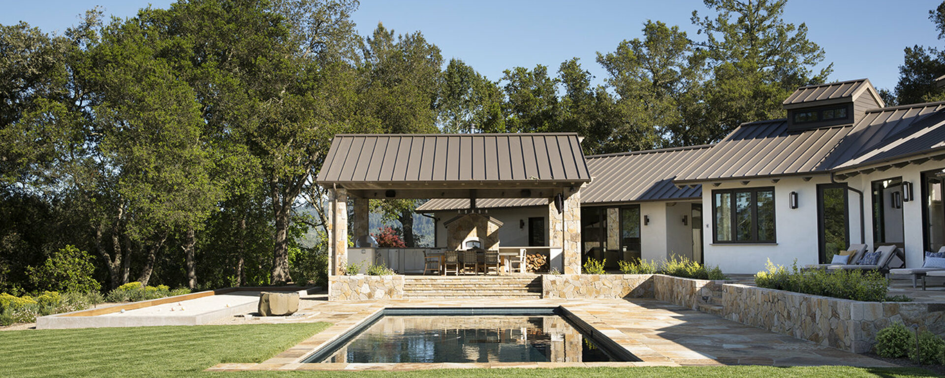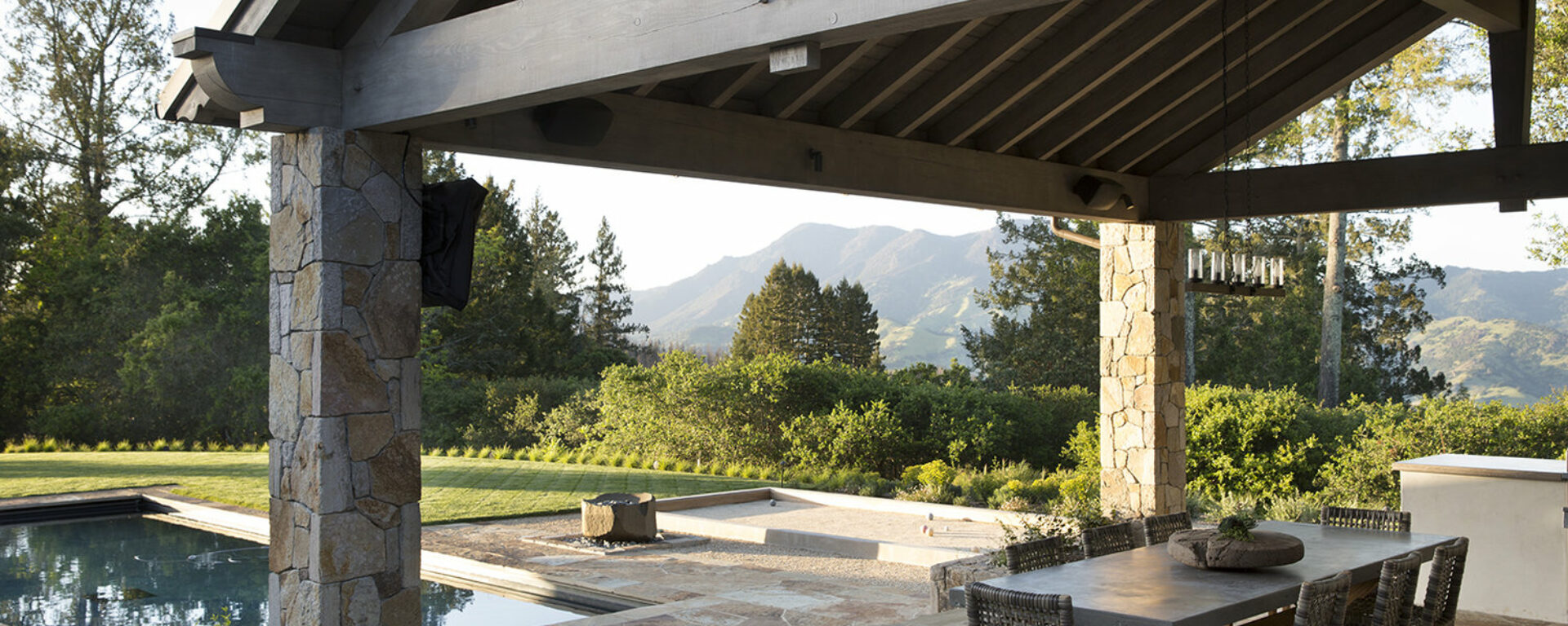 At this Healdsburg residence, we created a warm and inviting patio and pool area with Multiblend Flagstone, Pool Coping, and St. Helena Cottage Thin Veneer.