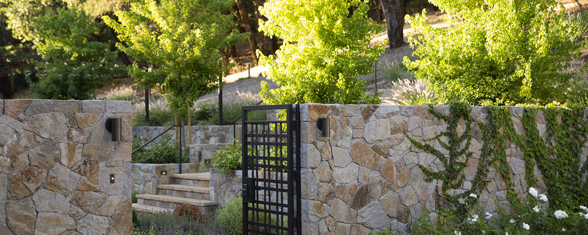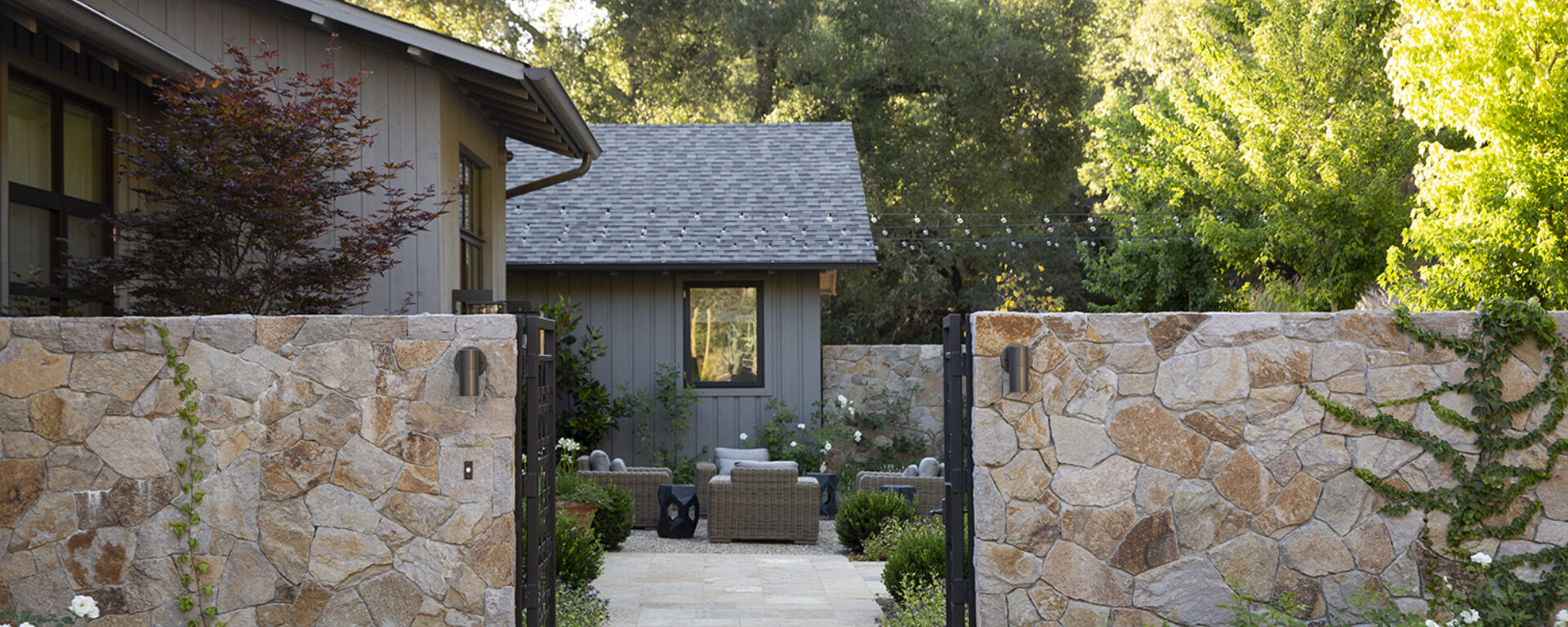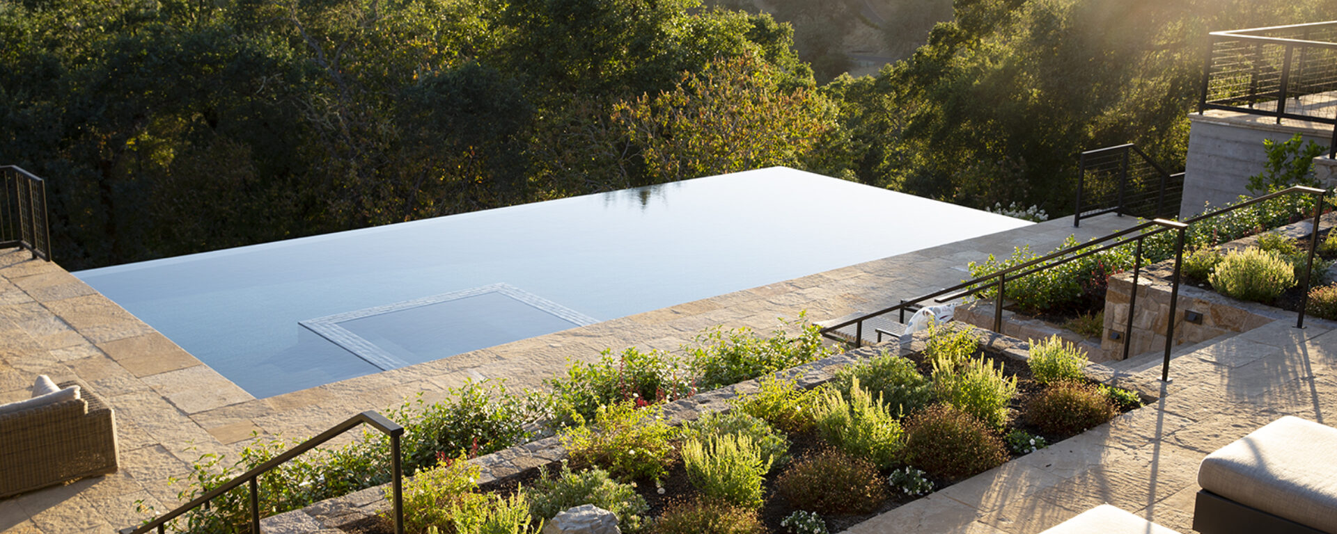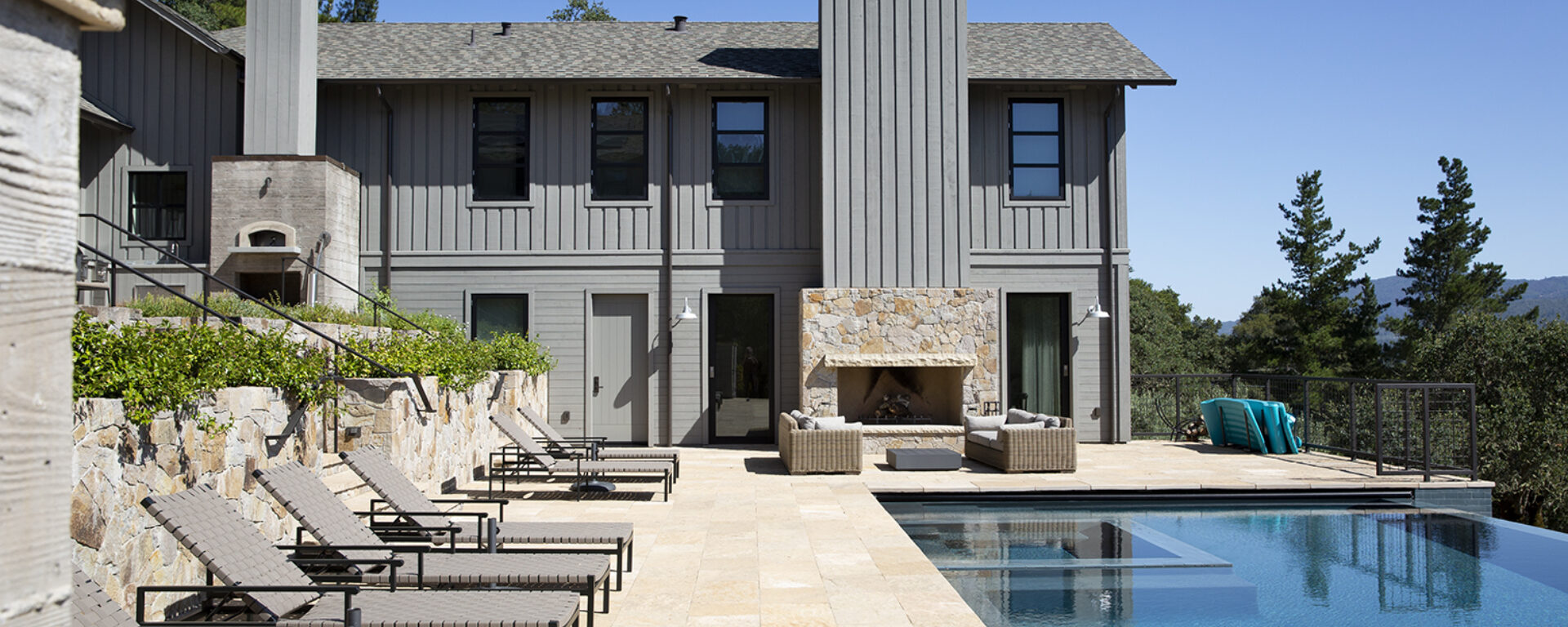 At this pool-side residence, earth tones with copper highlights warm this jaw-dropping infinity pool where Sonoma Buff Natural Cleft Pool Coping and Cleft Paving was used. For the entrance, St. Helena Cottage Thin Veneer warmly welcomes guests.Applications