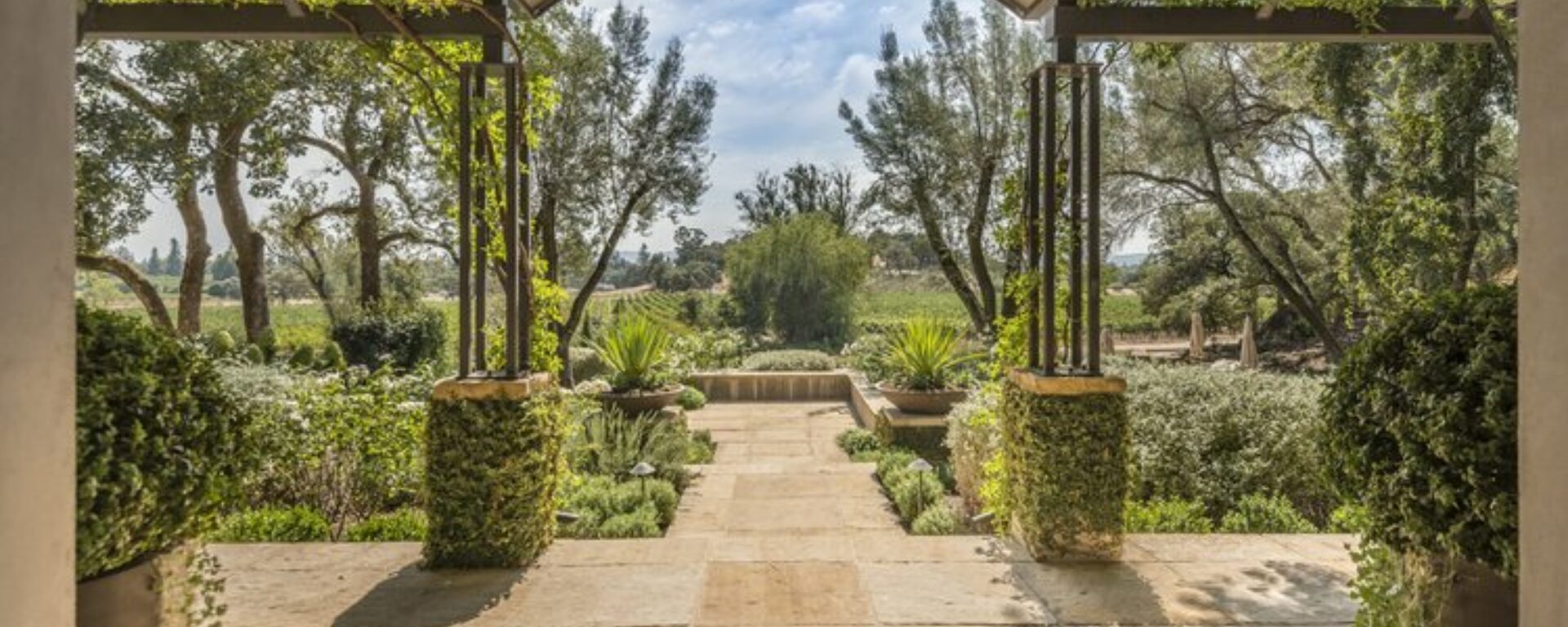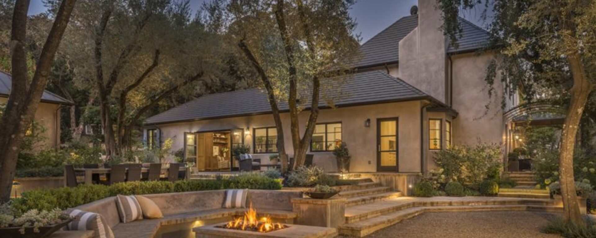 At this villa-like estate, Sequoia Buff Natural Cleft Paving and Wall Caps blend beautifully with the natural surroundings, complimenting the entry way all the way through to the back patio and gathering area.Applications